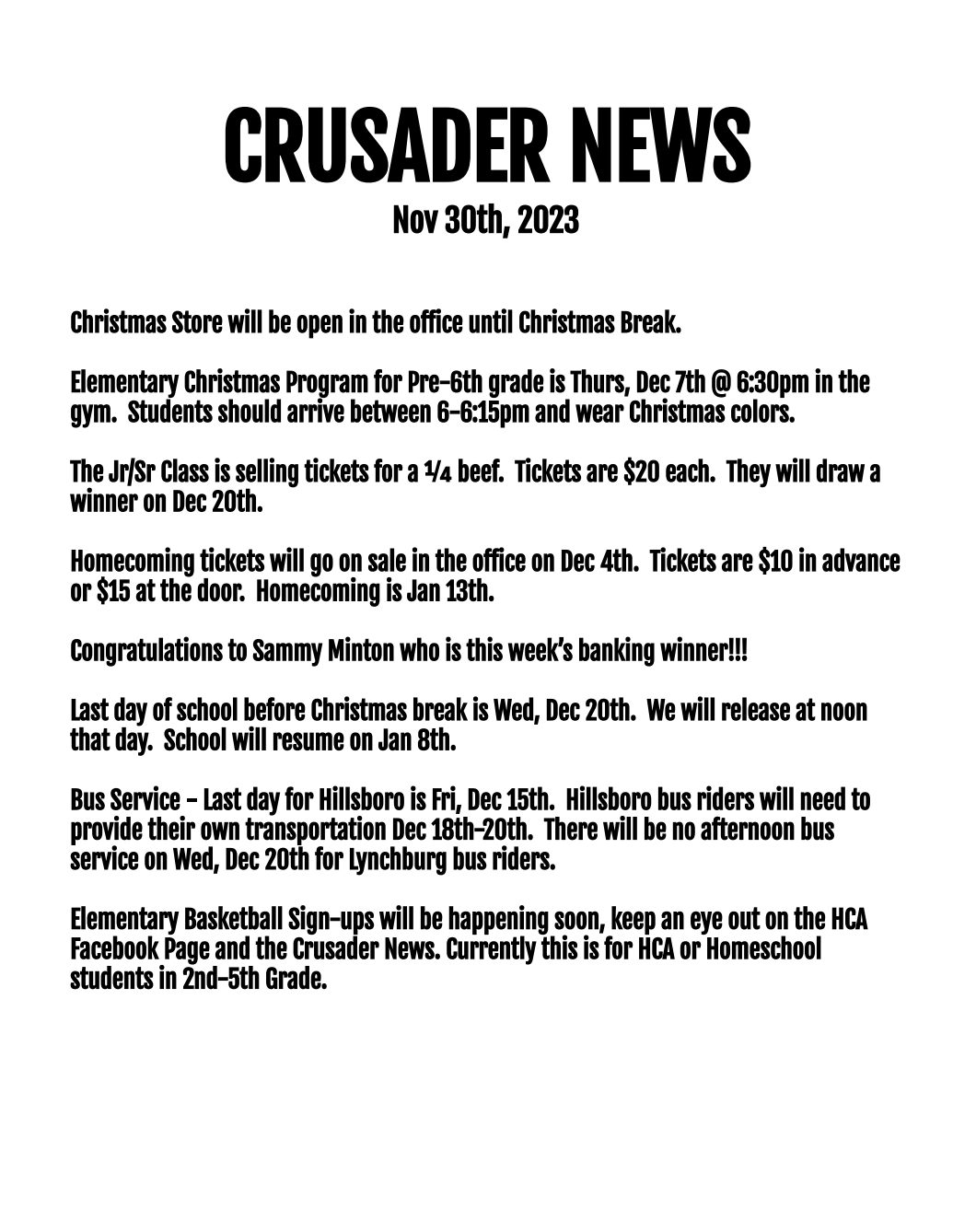 HCA is CLOSED on FRIDAY, DECEMBER 12th, 2025 due to the road conditions. Stay safe and warm!